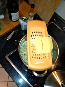 Der Teig wird mit dem Schaber durch die Löcher gestrichen. so kommt die Kraft nur von oben und der Topf rutscht nicht hin und her.